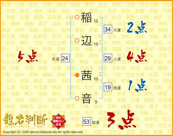 稲(15画)辺(19画) 茜(10画)音(9画)