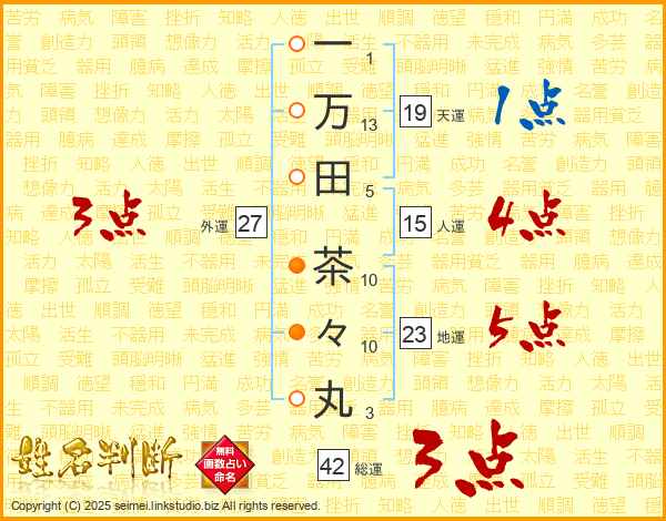 一(1画)万(13画)田(5画) 茶(10画)々(10画)丸(3画)
