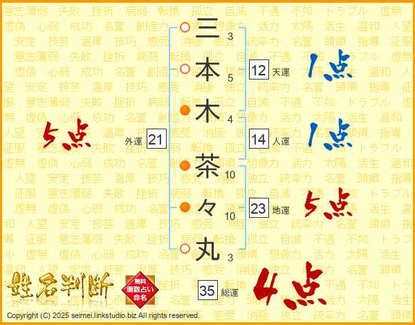 三(3画)本(5画)木(4画) 茶(10画)々(10画)丸(3画)