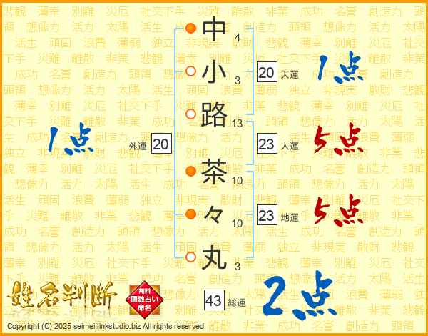 生活面を象徴する運勢です。外部から受ける影響力を表し、結婚運、家庭運や職場、環境への順応性を表します。総運から人運を引いた画数。姓や名が1文字の場合を除く。
