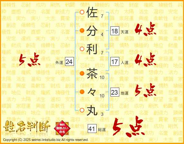 佐(7画)分(4画)利(7画) 茶(10画)々(10画)丸(3画)