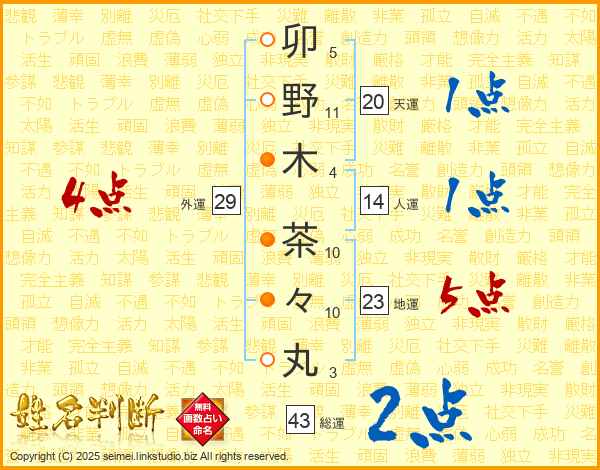 卯(5画)野(11画)木(4画) 茶(10画)々(10画)丸(3画)