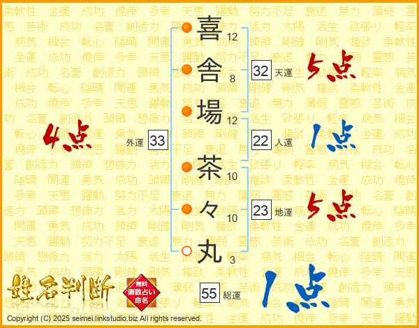 喜(12画)舎(8画)場(12画) 茶(10画)々(10画)丸(3画)