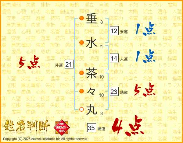 垂水茶々丸さんの総運は35画の4点!