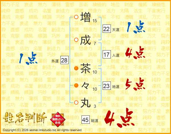 増(15画)成(7画) 茶(10画)々(10画)丸(3画)