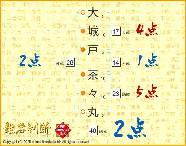 生活面を象徴する運勢です。外部から受ける影響力を表し、結婚運、家庭運や職場、環境への順応性を表します。総運から人運を引いた画数。姓や名が1文字の場合を除く。