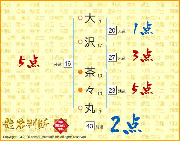 大沢茶々丸さんの外運は16画の5点!
