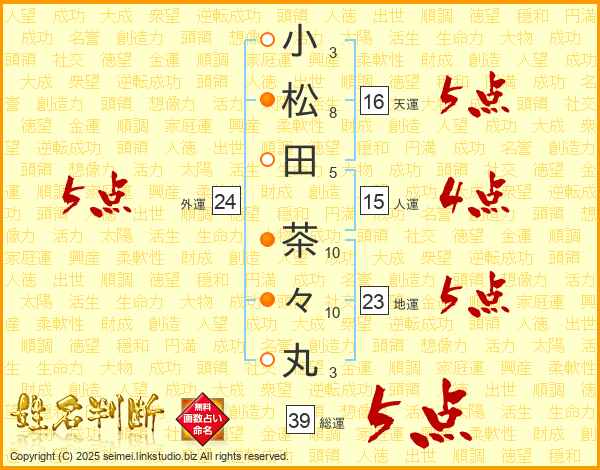 小(3画)松(8画)田(5画) 茶(10画)々(10画)丸(3画)