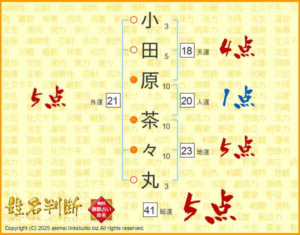 生活面を象徴する運勢です。外部から受ける影響力を表し、結婚運、家庭運や職場、環境への順応性を表します。総運から人運を引いた画数。姓や名が1文字の場合を除く。