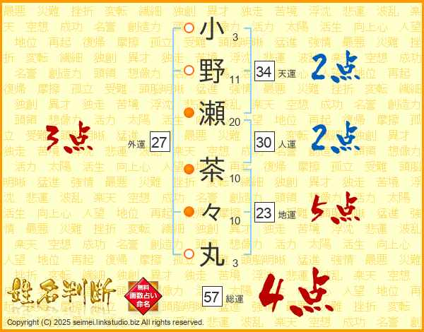 小(3画)野(11画)瀬(20画) 茶(10画)々(10画)丸(3画)