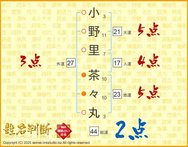 小(3画)野(11画)里(7画) 茶(10画)々(10画)丸(3画)