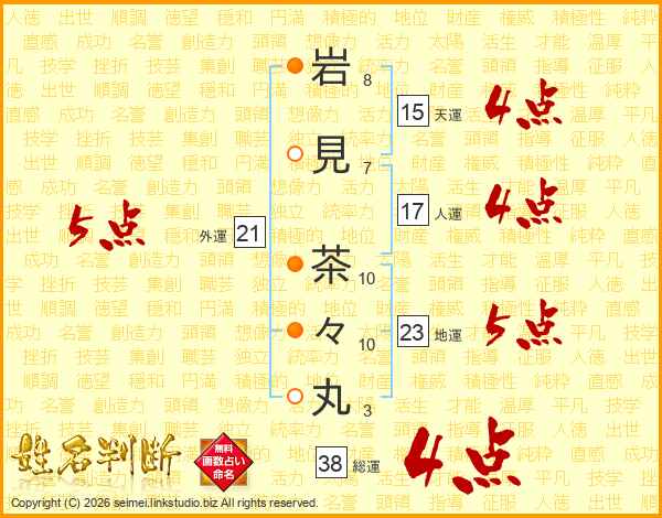 岩(8画)見(7画) 茶(10画)々(10画)丸(3画)