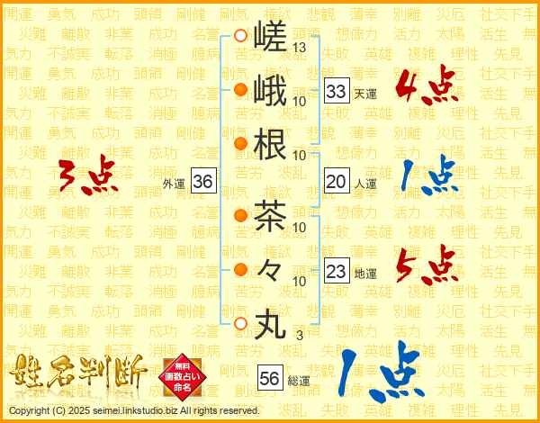 嵯(13画)峨(10画)根(10画) 茶(10画)々(10画)丸(3画)