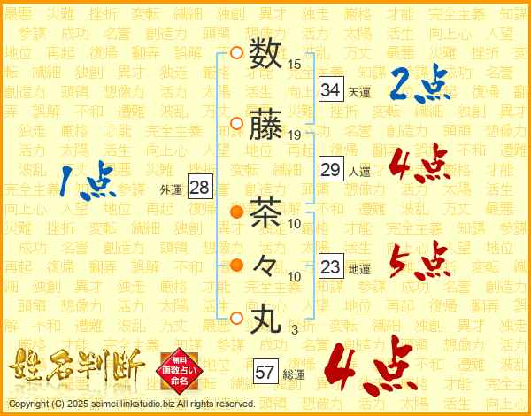 数(15画)藤(19画) 茶(10画)々(10画)丸(3画)
