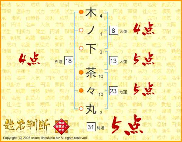木ノ下茶々丸さんの外運は18画の4点!