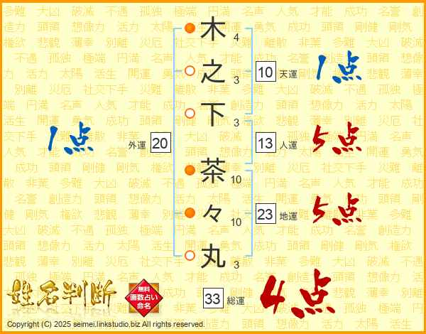 木(4画)之(3画)下(3画) 茶(10画)々(10画)丸(3画)