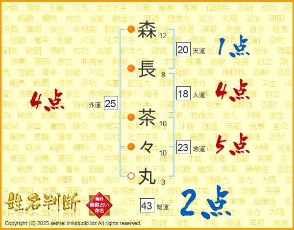 森(12画)長(8画) 茶(10画)々(10画)丸(3画)