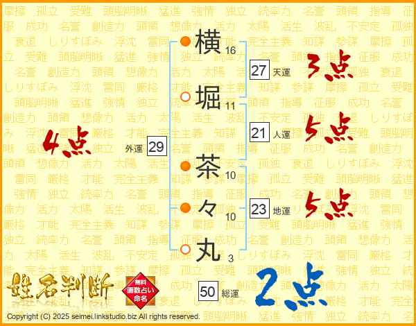横堀茶々丸さんの外運は29画の4点!