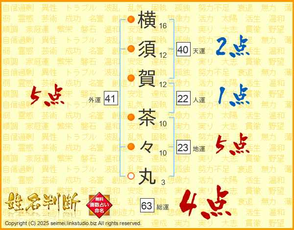横(16画)須(12画)賀(12画) 茶(10画)々(10画)丸(3画)