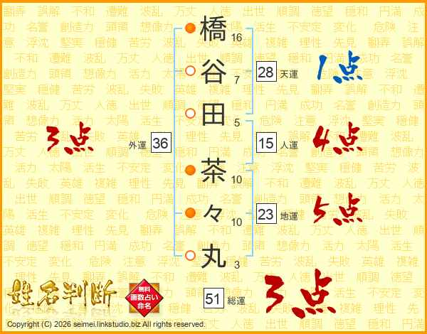 橋谷田茶々丸さんの総運は51画の3点!