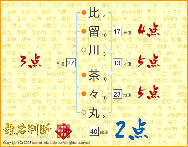 比(4画)留(10画)川(3画) 茶(10画)々(10画)丸(3画)