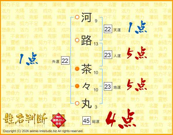 生活面を象徴する運勢です。外部から受ける影響力を表し、結婚運、家庭運や職場、環境への順応性を表します。総運から人運を引いた画数。姓や名が1文字の場合を除く。