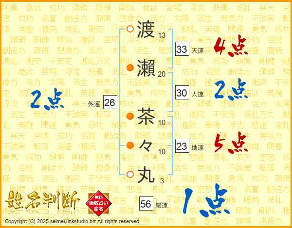 渡瀨茶々丸さんの総運は56画の1点!