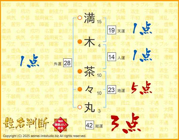 満(15画)木(4画) 茶(10画)々(10画)丸(3画)