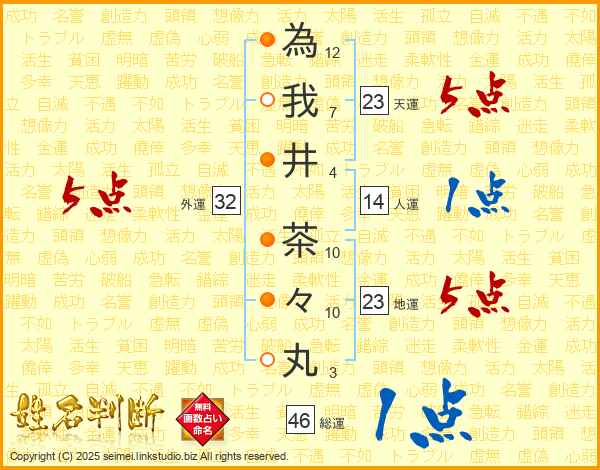 生活面を象徴する運勢です。外部から受ける影響力を表し、結婚運、家庭運や職場、環境への順応性を表します。総運から人運を引いた画数。姓や名が1文字の場合を除く。