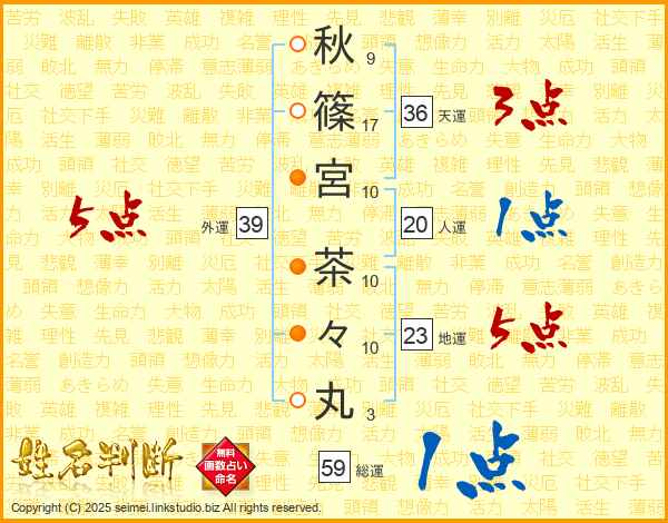 秋(9画)篠(17画)宮(10画) 茶(10画)々(10画)丸(3画)