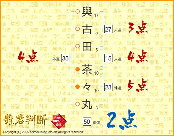 與(17画)古(5画)田(5画) 茶(10画)々(10画)丸(3画)
