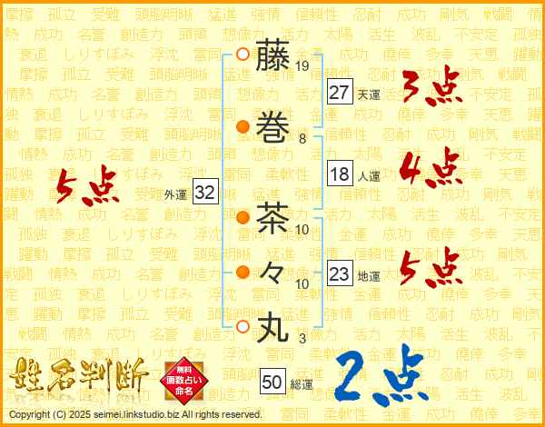 藤(19画)巻(8画) 茶(10画)々(10画)丸(3画)