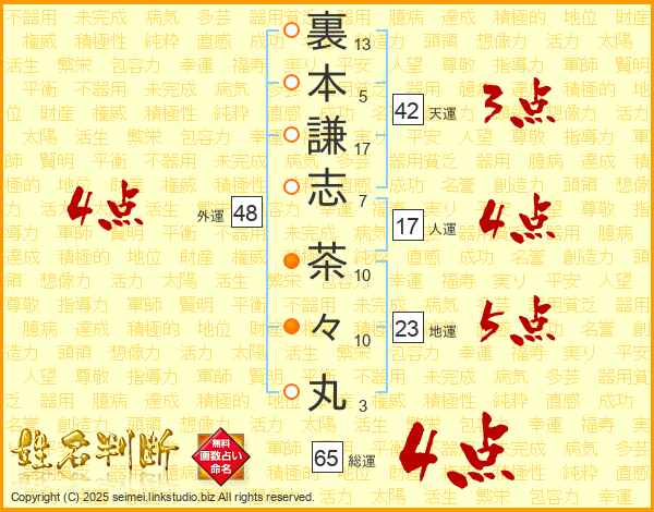 裏(13画)本(5画)謙(17画)志(7画) 茶(10画)々(10画)丸(3画)