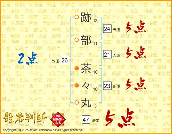 跡部茶々丸さんの総運は47画の5点!