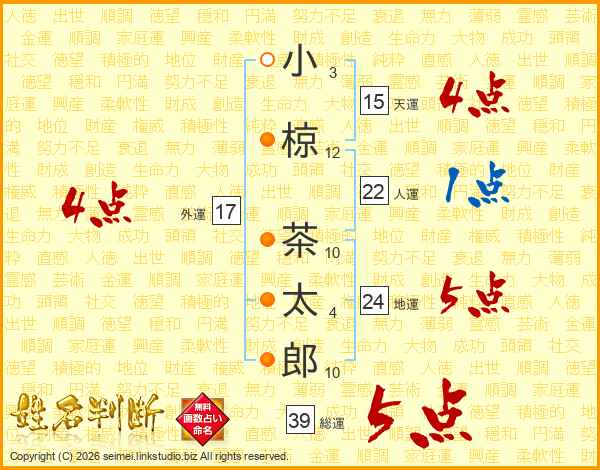 小椋茶太郎さんの総運は39画の5点!
