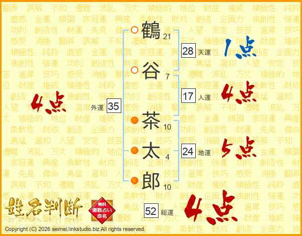 鶴(21画)谷(7画) 茶(10画)太(4画)郎(10画)