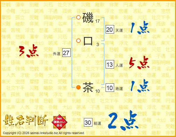 生活面を象徴する運勢です。外部から受ける影響力を表し、結婚運、家庭運や職場、環境への順応性を表します。総運から人運を引いた画数。姓や名が1文字の場合を除く。