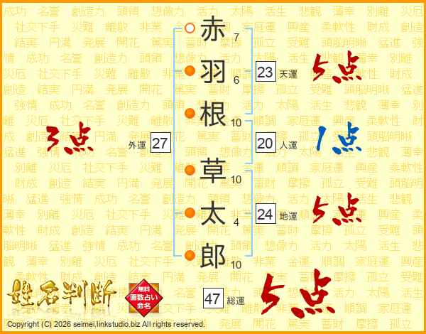 赤(7画)羽(6画)根(10画) 草(10画)太(4画)郎(10画)