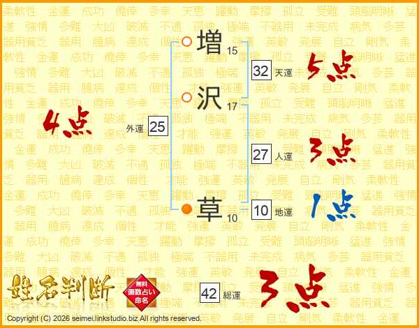 生活面を象徴する運勢です。外部から受ける影響力を表し、結婚運、家庭運や職場、環境への順応性を表します。総運から人運を引いた画数。姓や名が1文字の場合を除く。