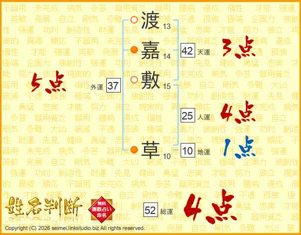 生活面を象徴する運勢です。外部から受ける影響力を表し、結婚運、家庭運や職場、環境への順応性を表します。総運から人運を引いた画数。姓や名が1文字の場合を除く。