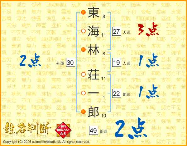 東(8画)海(11画)林(8画) 荘(11画)一(1画)郎(10画)