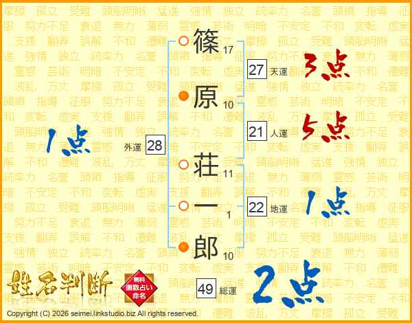 篠(17画)原(10画) 荘(11画)一(1画)郎(10画)