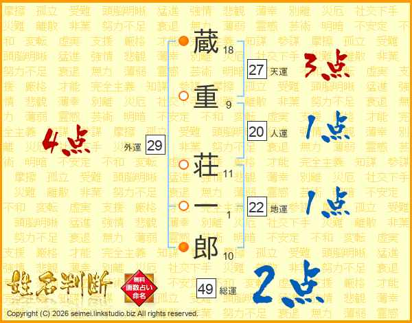 蔵(18画)重(9画) 荘(11画)一(1画)郎(10画)