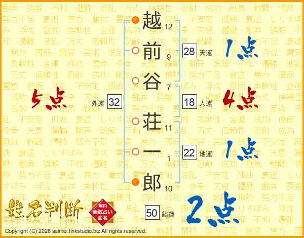 越(12画)前(9画)谷(7画) 荘(11画)一(1画)郎(10画)