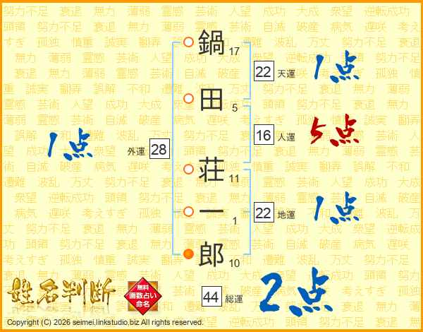 鍋(17画)田(5画) 荘(11画)一(1画)郎(10画)