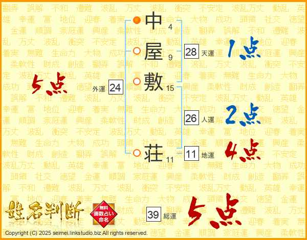 中(4画)屋(9画)敷(15画) 荘(11画)