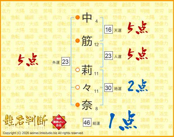 中(4画)筋(12画) 莉(11画)々(11画)奈(8画)