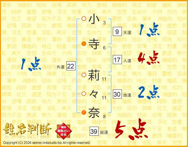 小寺莉々奈さんの総運は39画の5点!