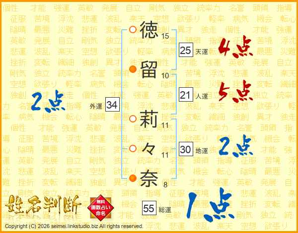 徳(15画)留(10画) 莉(11画)々(11画)奈(8画)