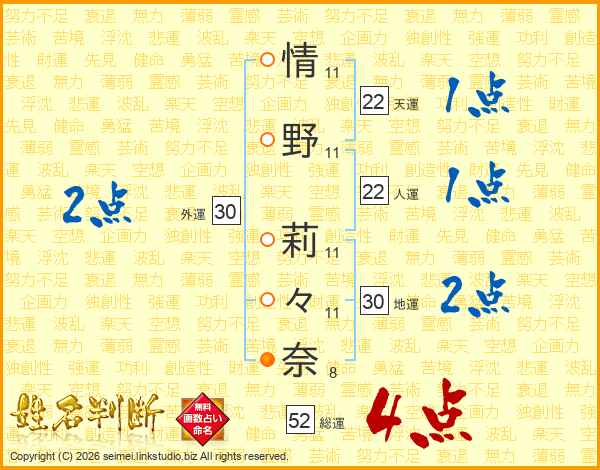 情(11画)野(11画) 莉(11画)々(11画)奈(8画)